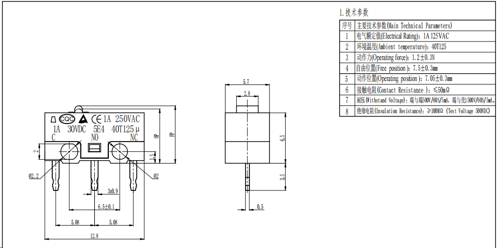 Using a patented snap-action quick-trigger mechanism, the trigger response time is ≤8ms, improving performance by 25% compared to traditional micro switches. The trigger travel is precisely controlled between 0.3-1.0mm, with an operating force range of 1.5-4N. The pressing feedback is clear and crisp, without sticking or free play, allowing for precise control of 'light touch to connect, release to break,' perfectly suited for scenarios requiring high trigger sensitivity. The contacts are made of high-purity silver-tin alloy and processed with precise spot welding, with an initial contact resistance of ≤30mΩ. The rated load supports 1A/250V AC and 3A/125V AC, effectively preventing contact heating or burning when current passes through.